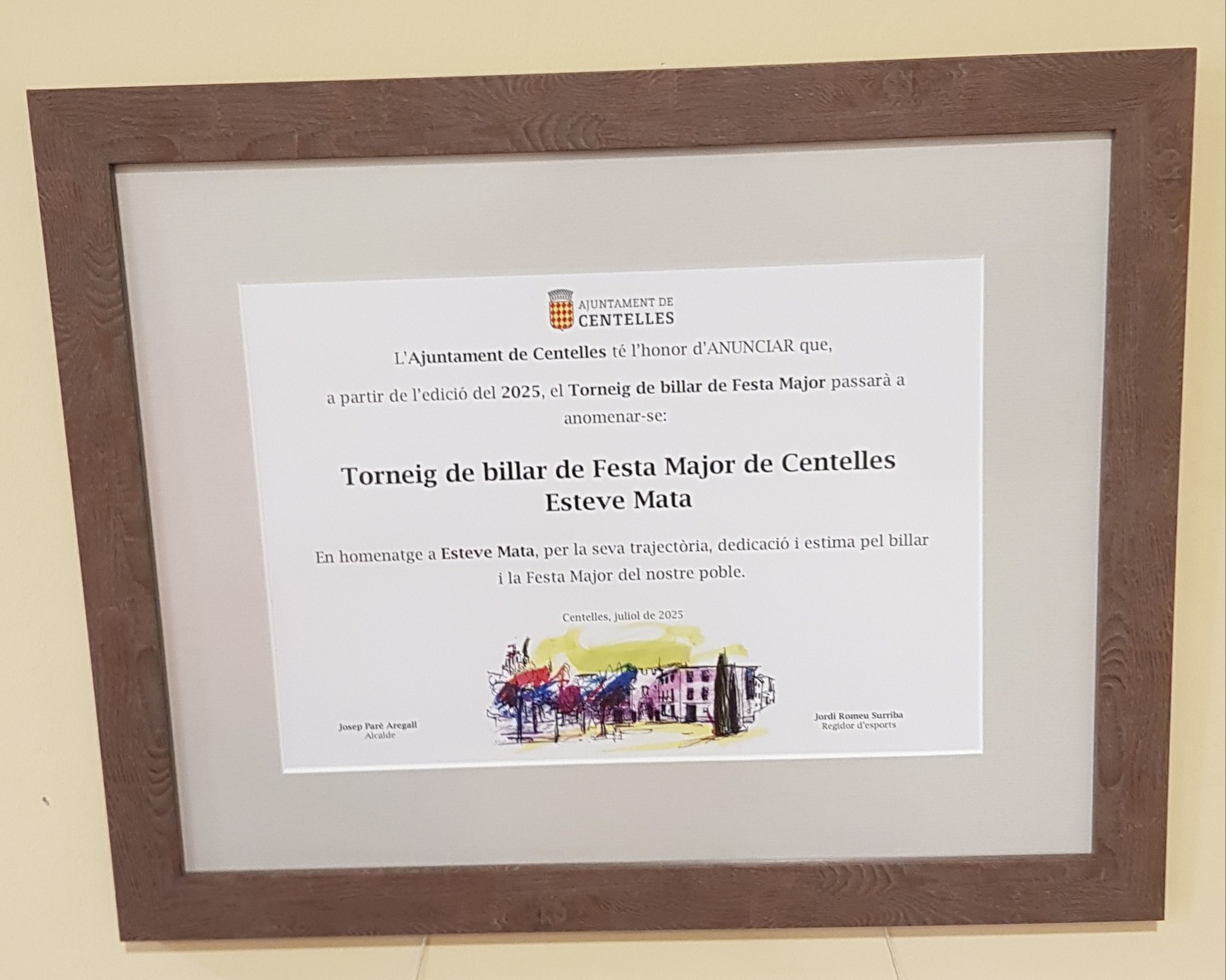 El dissabte 12 de juliol es va celebrar a Centelles l'homenatge per part de l'Ajuntament i de la Secció de Billar de la Penya Escacs Centelles a Esteve Mata Pardo, en reconeixement a la seva trajectòria esportiva.